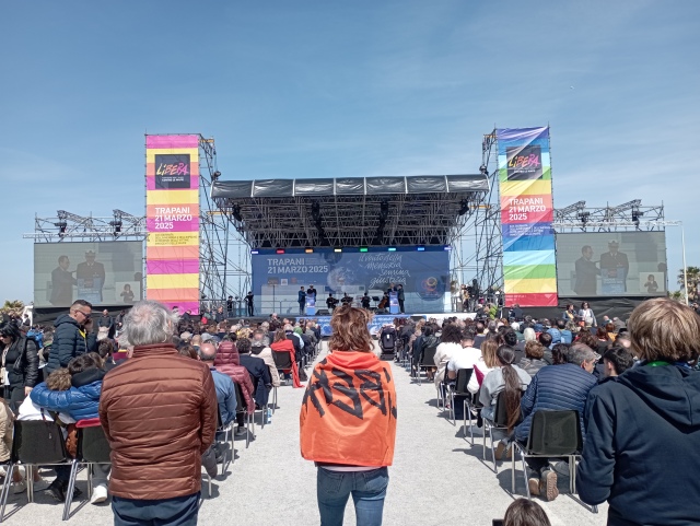 Répondant à l’appel de Libera, des étudiants, des associations, des familles des victimes et des représentants institutionnels se sont réunis Piazza Umberto I et Piazzale Ilio, point de départ de la procession qui traversera la ville. Dans le cortège de tête, un immense drapeau de la paix a été déployé, encadré par des familles de victimes suivi par les élus avec leur écharpe tricolore. Un geste symbolique qui souligne le rôle des institutions dans la lutte contre la criminalité organisée, main dans la main avec les citoyens.« Ici c’est le peuple qui s’est mobilisé » commente Layla, tandis que Sabrina se dit très impressionnée par la foule ; cinquante mille personnes en marche, poussées par un vent de mémoire et de justice qui vient de la mer et se fraye un chemin dans les rues de Trapani ; « J’aime beaucoup la bonne humeur de la manifestation, c’est plus joyeux que chez nous. A Marseille, on a fait des marches blanches mais il n’y a jamais eu autant de monde ; là on voit que les gens ne viennent pas uniquement pleurer leurs morts, ils sont là aussi pour dire que la vie continue, et le combat aussi ».